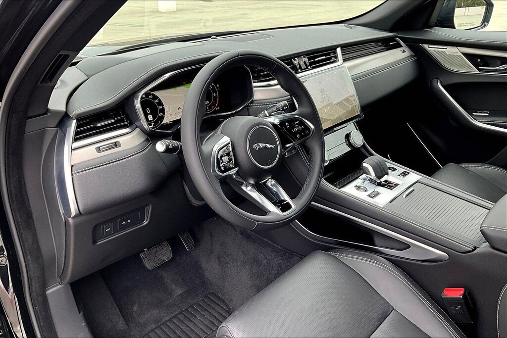 F-PACE P250 R-Dynamic S, 4D Sport Utility, 2.0L I4 Turbocharged, 8-Speed Automatic, AWD, Santorini, Ebony/Ebony/Ebony w/Perforated Windsor Leather Seat Trim, 13 Speakers, 4-Wheel Disc Brakes, ABS brakes, Air Conditioning, Alloy wheels, AM/FM radio: SiriusXM, Apple CarPlay/Android Auto, Auto High-beam Headlights, Auto tilt-away steering wheel, Auto-dimming door mirrors, Auto-dimming Rear-View mirror, Automatic temperature control, Brake assist, Bumpers: body-color, Compass, Delay-off headlights, Driver door bin, Driver vanity mirror, Dual front impact airbags, Dual front side impact airbags, Electronic Stability Control, Emergency communication system: Remote SOS Emergency Call, Exterior Parking Camera Rear, Four wheel independent suspension, Front anti-roll bar, Front Bucket Seats, Front Center Armrest, Front dual zone A/C, Front fog lights, Front reading lights, Fully automatic headlights, Garage door transmitter: HomeLink, Heads-Up Display, Heated door mirrors, Heated front seats, Heated Front Sport Seats, Heated steering wheel, Illuminated entry, Leather Shift Knob, Leather steering wheel, Low tire pressure warning, Memory seat, Navigation system: Pivi Pro (Connected Navigation), Occupant sensing airbag, Outside temperature display, Overhead airbag, Overhead console, Panic alarm, Passenger door bin, Passenger vanity mirror, Power door mirrors, Power driver seat, Power Liftgate, Power moonroof, Power passenger seat, Power steering, Power windows, Radio data system, Radio: Meridian 400W Sound System, Rain sensing wipers, Rear anti-roll bar, Rear fog lights, Rear reading lights, Rear seat center armrest, Rear window defroster, Rear window wiper, Remote keyless entry, Security system, Speed control, Speed-sensing steering, Split folding rear seat, Spoiler, Sport steering wheel, Steering wheel memory, Steering wheel mounted audio controls, Tachometer, Telescoping steering wheel, Tilt steering wheel, Traction control, Trip computer, Turn signal indicator mirrors, Variably intermittent wipers.