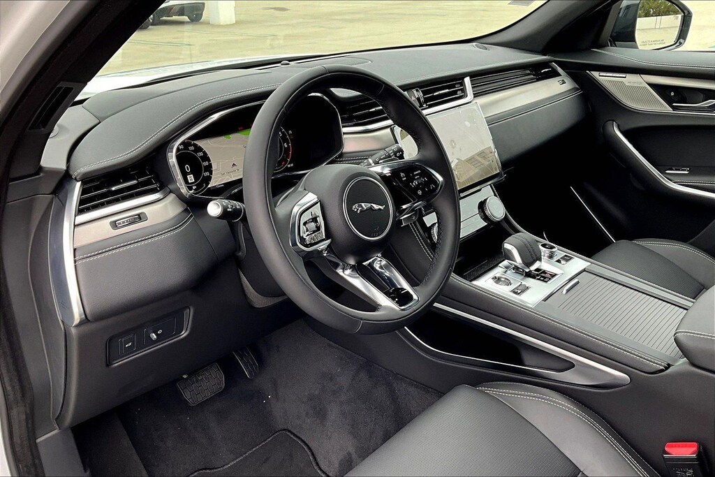 F-PACE P250 R-Dynamic S, 4D Sport Utility, 2.0L I4 Turbocharged, 8-Speed Automatic, AWD, Fuji, Ebony/Ebony/Ebony w/Perforated Windsor Leather Seat Trim, 13 Speakers, 4-Wheel Disc Brakes, ABS brakes, Air Conditioning, Alloy wheels, AM/FM radio: SiriusXM, Apple CarPlay/Android Auto, Auto High-beam Headlights, Auto tilt-away steering wheel, Auto-dimming door mirrors, Auto-dimming Rear-View mirror, Automatic temperature control, Brake assist, Bumpers: body-color, Compass, Delay-off headlights, Driver door bin, Driver vanity mirror, Dual front impact airbags, Dual front side impact airbags, Electronic Stability Control, Emergency communication system: Remote SOS Emergency Call, Exterior Parking Camera Rear, Four wheel independent suspension, Front anti-roll bar, Front Bucket Seats, Front Center Armrest, Front dual zone A/C, Front fog lights, Front reading lights, Fully automatic headlights, Garage door transmitter: HomeLink, Heads-Up Display, Heated door mirrors, Heated front seats, Heated Front Sport Seats, Heated steering wheel, Illuminated entry, Leather Shift Knob, Leather steering wheel, Low tire pressure warning, Memory seat, Navigation system: Pivi Pro (Connected Navigation), Occupant sensing airbag, Outside temperature display, Overhead airbag, Overhead console, Panic alarm, Passenger door bin, Passenger vanity mirror, Power door mirrors, Power driver seat, Power Liftgate, Power moonroof, Power passenger seat, Power steering, Power windows, Radio data system, Radio: Meridian 400W Sound System, Rain sensing wipers, Rear anti-roll bar, Rear fog lights, Rear reading lights, Rear seat center armrest, Rear window defroster, Rear window wiper, Remote keyless entry, Security system, Speed control, Speed-sensing steering, Split folding rear seat, Spoiler, Sport steering wheel, Steering wheel memory, Steering wheel mounted audio controls, Tachometer, Telescoping steering wheel, Tilt steering wheel, Traction control, Trip computer, Turn signal indicator mirrors, Variably intermittent wipers.